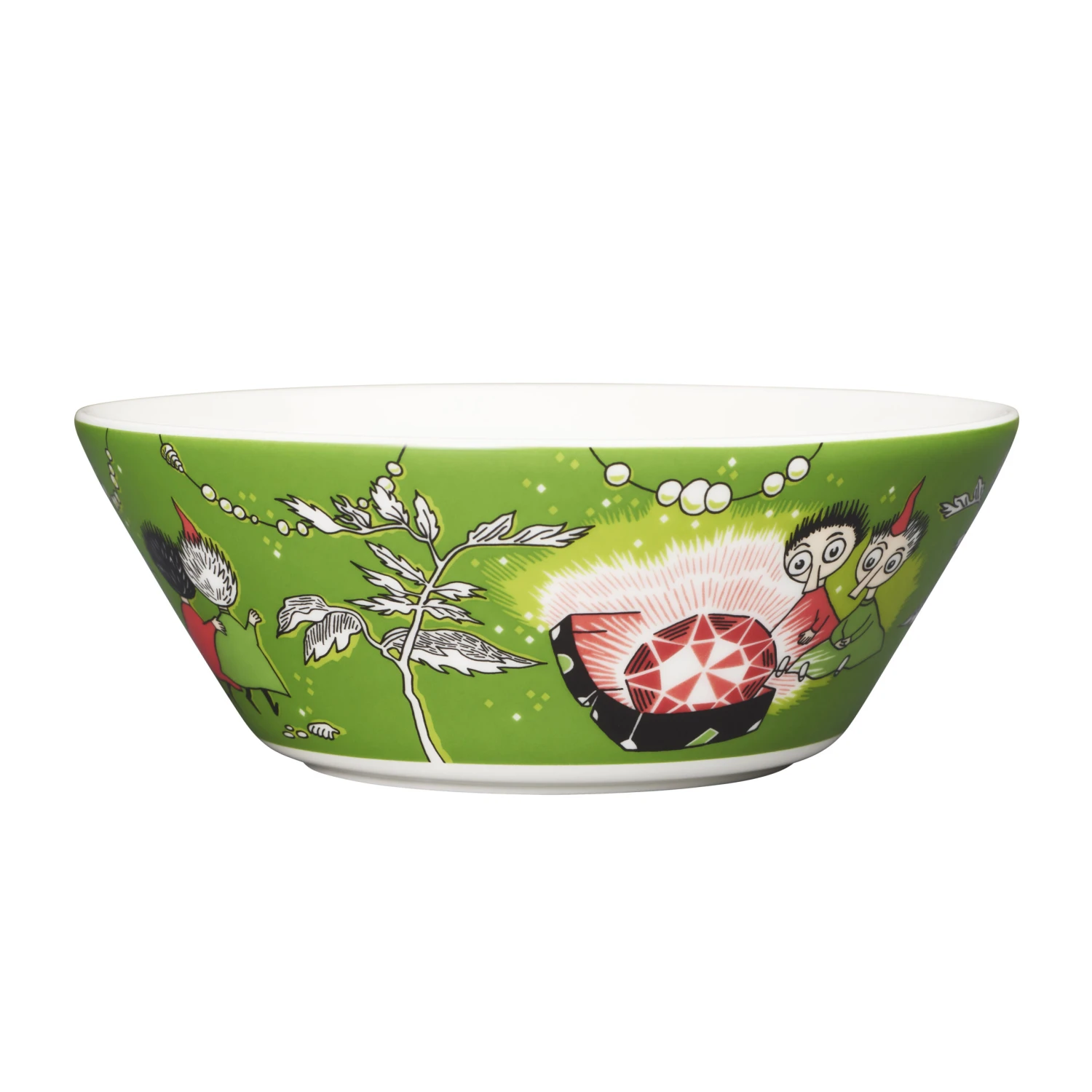 Geniet van een kom muesli, snacks of soep in de Thingumy & Bob & King’s Ruby Moomin kom van Arabia! Als onderdeel van de voorjaarscollectie 2018 toont deze kom een afbeelding van één van de beroemde verhalen van Tove Jansson over Moomin en zijn vrienden, ditmaal gebaseerd op ‘Finn Family Moomin’ uit 1948. In dit verhaal reist de Hobgoblin naar de Moominvallei op zoek naar de King’s Ruby. Personages Thingumy & Bob, die hun eigen geheime taal spreken, hebben de robijn in hun koffer verborgen en zijn naar de Moominvallei verhuisd op zoek naar een veilig onderkomen. Tijdens een feest laat de Hobgoblin alle personages in de Moominvallei één wens doen: de slimme Thingumy & Bob wensen een replica van de King’s Ruby… Leuk voor jong en oud!